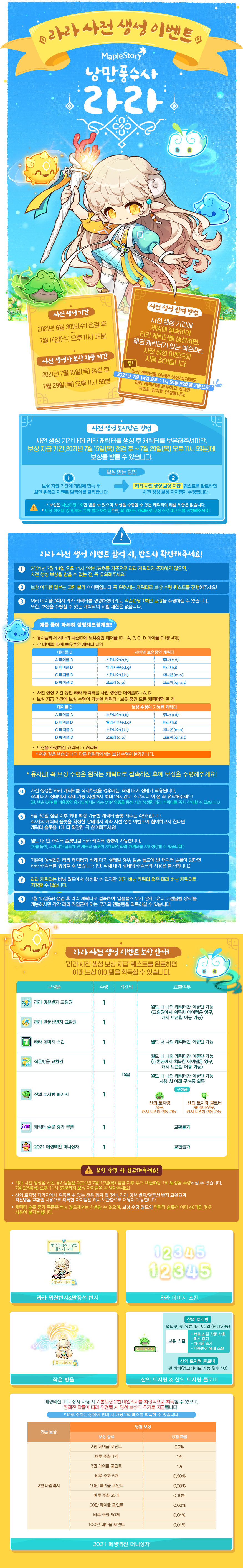 | 메이플 낭만 풍수사 라라 모험 응원 이벤트 - 라라 육성 지원 이벤트 (0) | 2021.07.15 |