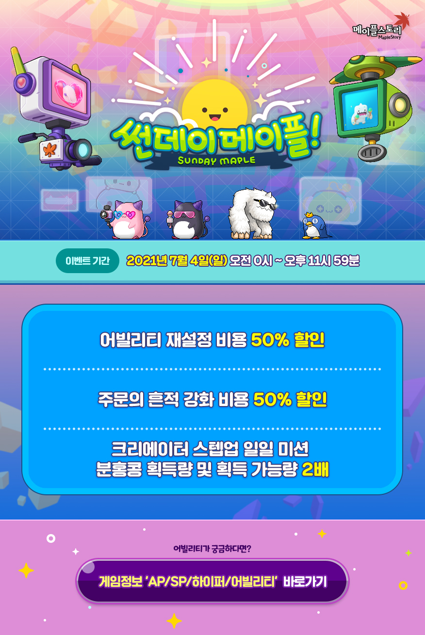 | 2021.07.11 썬데이메이플 - 몬스터파크 클경 50%, 분홍콩 획득량 2배, 선택 아케인 심볼 50개 지급 (0) | 2021.07.11 |