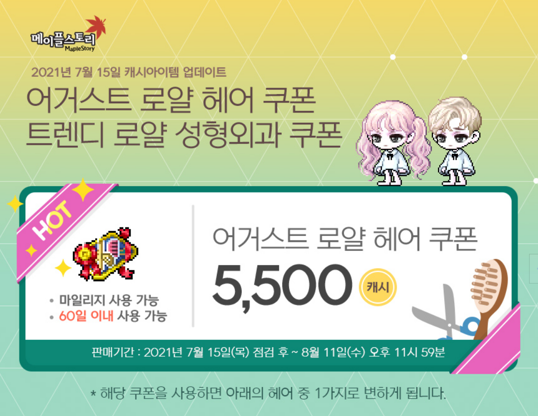 | 2021년 7월 15일 메이플 캐시아이템 업데이트 - 알쏭달쏭 믹스 염색&컬러렌즈 쿠폰 (0) | 2021.07.15 |