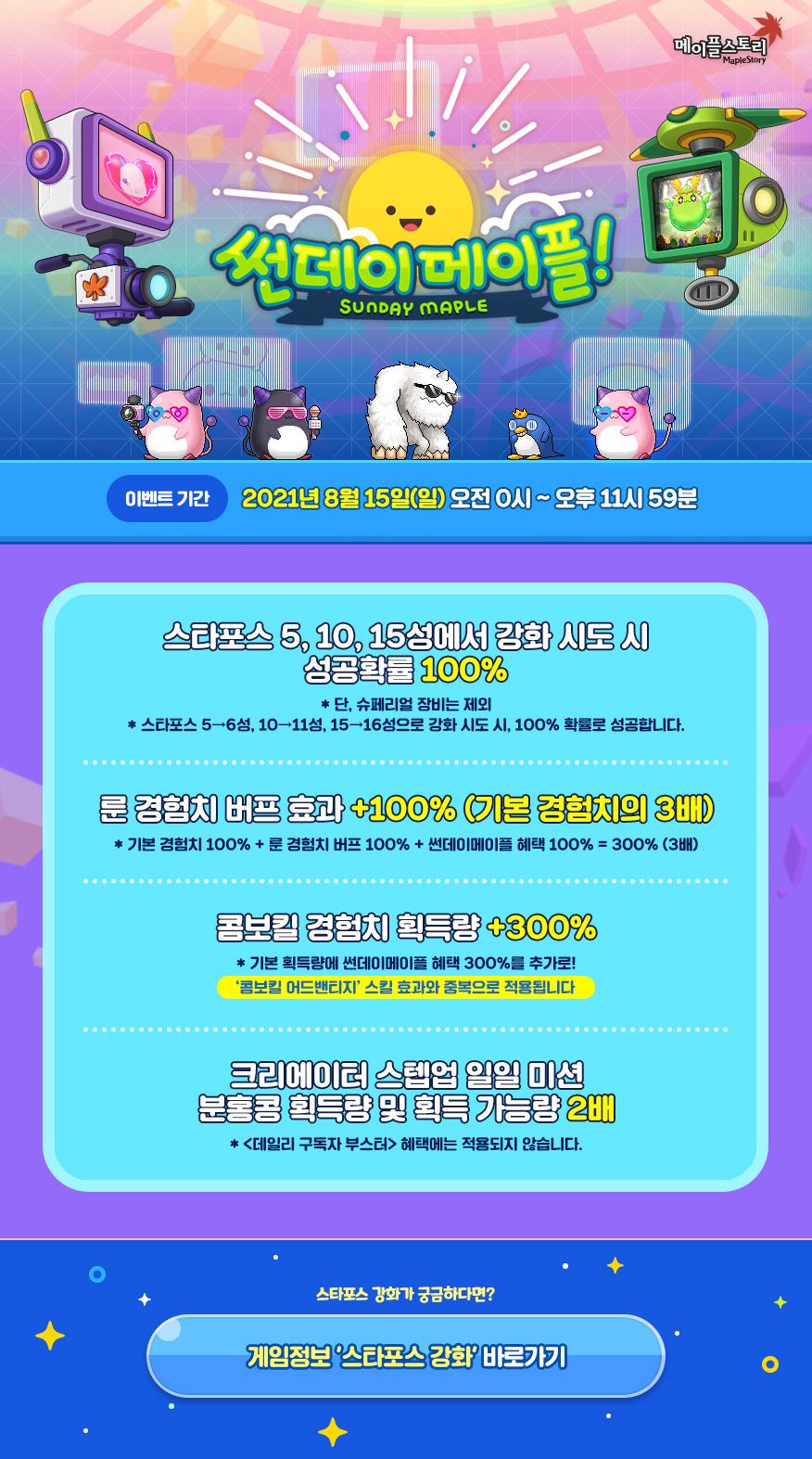 2021.08.15 썬데이메이플 - 스타포스 5,10,15 성공확률 100%, 룬 경험치 100%, 콤보킬 경험치 300%, 분홍콩 획득량 2배