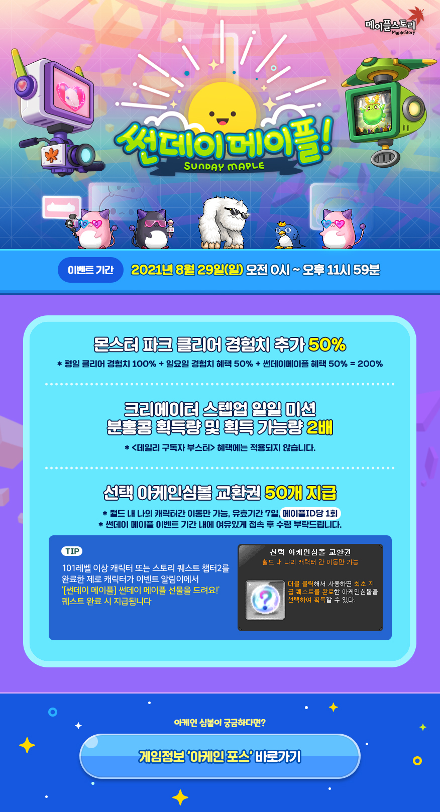 | 2021.08.15 썬데이메이플 - 스타포스 5,10,15 성공확률 100%, 룬 경험치 100%, 콤보킬 경험치 300%, 분홍콩 획득량 2배 (0) | 2021.08.13 |