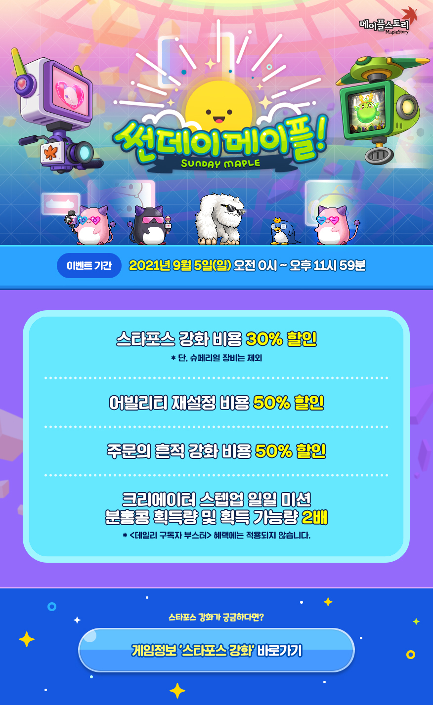 2021년 09월 05일 썬데이메이플! - 스타포스 강화 할인 30%, 어빌리티 재설정 50% 할인, 주문의 흔적(주흔) 강화비용 50%할인, 분홍콩 획득량 2배