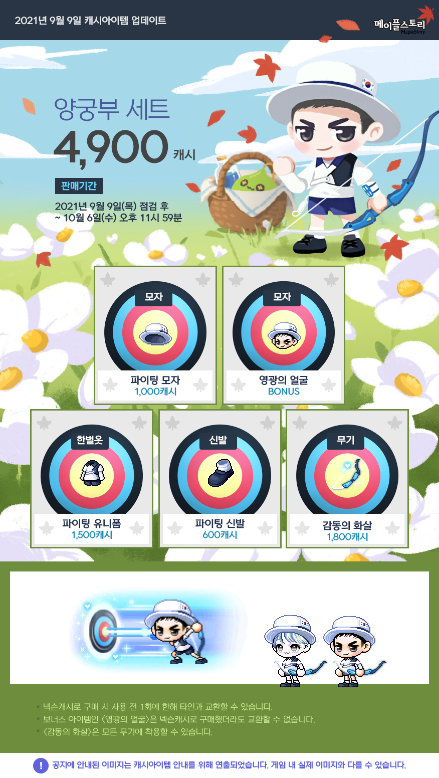 | 메이플 9월 9일 캐시아이템 업데이트 - 악토버 로얄 헤어& 트렌디 로얄 성형외과 쿠폰/헤어, 성형확률 (0) | 2021.09.09 |
