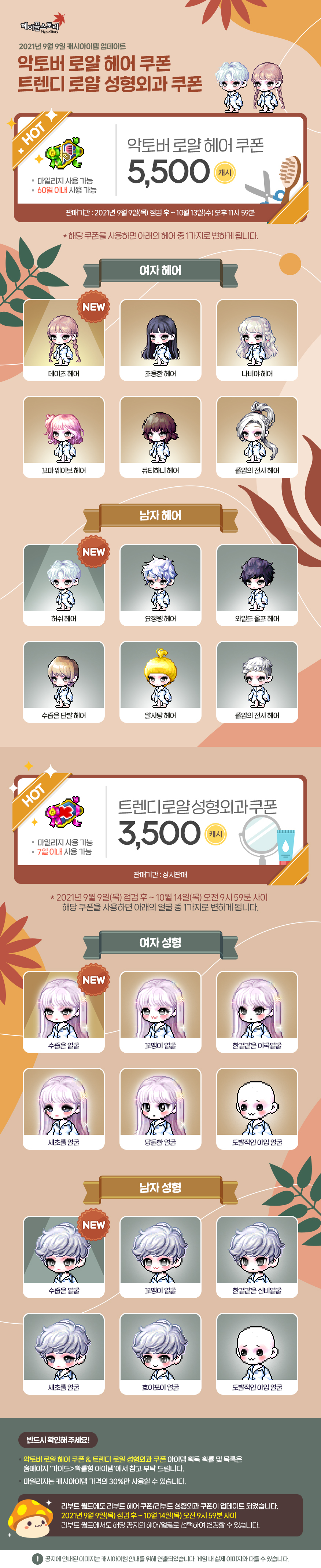| 메이플 9월 9일 캐시아이템 업데이트 - 알쏭달쏭 믹스 염색&컬러렌즈 쿠폰 (0) | 2021.09.09 |