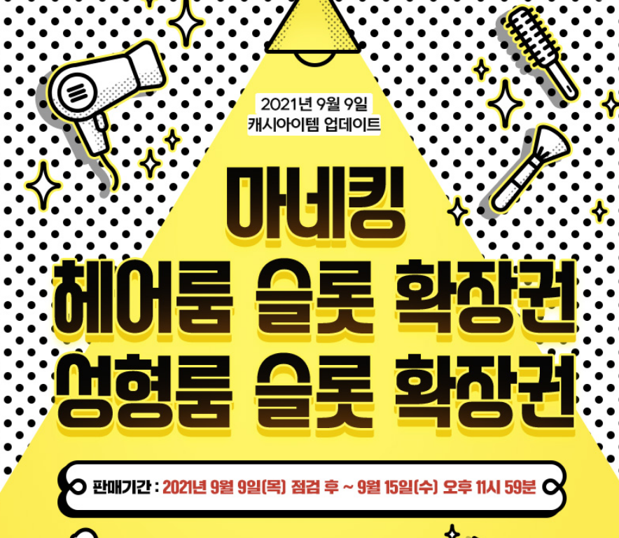| 메이플 9월 9일 캐시아이템 업데이트 - 알쏭달쏭 믹스 염색&컬러렌즈 쿠폰 (0) | 2021.09.09 |