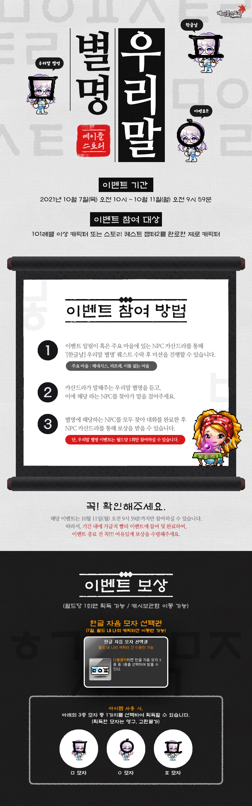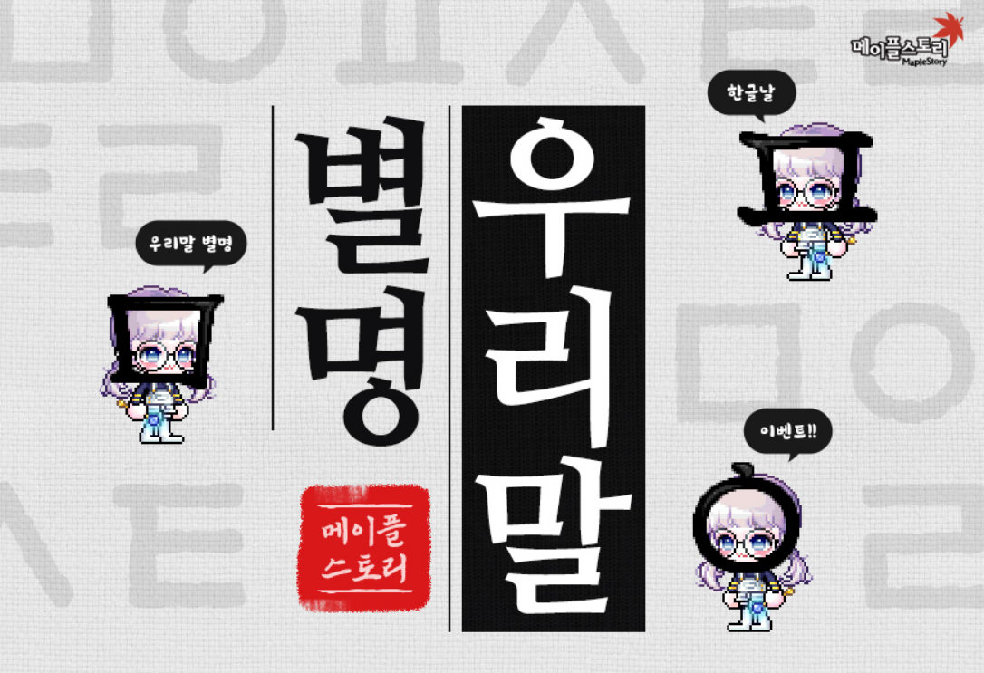 메이플스토리/이벤트 메이플 한글날 이벤트 우리말 별명 - 한글 자음 모자 선택권(ㅁ모자, ㅇ모자, ㅍ모자) 메이플엘리스 2021. 10. 5. 14:30 728x90 이벤트 기간 : 2021년 10월 07일 10시 00분 ~ 2021년 10월 11일 09시 59분 공유하기 게시글 관리 엘리스왕국 '메이플스토리 > 이벤트' 카테고리의 다른 글 (재진행)메이플스토리 카카오톡 이모티콘 출시 - 귀여움엔 누구보다 진심인 편 (0) 2021.10.11 2021. 10. 10 썬데이 메이플! - 위소울 5배, 어빌리티 재설정 50% 할인, 추추 코인 획득량 2배 (0) 2021.10.11 2021.10.03 썬데이 메이플! - 스타포스 5, 10, 15성에서 성공 확률 100%, 주문의 흔적 강화 비용 50% 할인, 추추 코인 획득 가능량 2배 (0) 2021.10.01 2021.09.26 썬데이메이플! - 추추 코인 획득량 2배, 몬스터컬렉션 신규 몬스터 등록 확률 100%, 의문의 모몽 3개 지급 (0) 2021.09.24 2021.09.19 썬데이 메이플! - 10성 이하 스타포스 강화 성공 시 1+1, 폴로와 프리토 경험치 2배, 불꽃늑대 경험치 2배, 추추 코인 획득량 2배 (0) 2021.09.17 '메이플스토리/이벤트' Related Articles (재진행)메이플스토리 카카오톡 이모티콘 출시 - 귀여움엔 누구보다 진심인 편 2021. 10. 10 썬데이 메이플! - 위소울 5배, 어빌리티 재설정 50% 할인, 추추 코인 획득량 2배 2021.10.03 썬데이 메이플! - 스타포스 5, 10, 15성에서 성공 확률 100%, 주문의 흔적 강화 비용 50% 할인, 추추 코인 획득 가능량 2배 2021.09.26 썬데이메이플! - 추추 코인 획득량 2배, 몬스터컬렉션 신규 몬스터 등록 확률 100%, 의문의 모몽 3개 지급