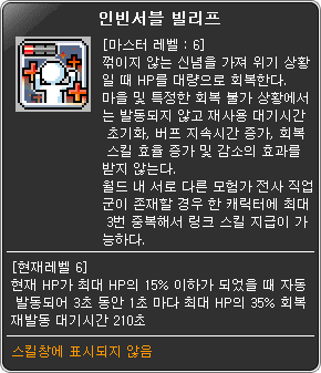 현재 HP가 최대 HP의 15% 이하가 되었을 때 자동 발동되어 3초 동안 1초 마다 최대 HP의 35% 회복, 재발동 대기시간 210초 |