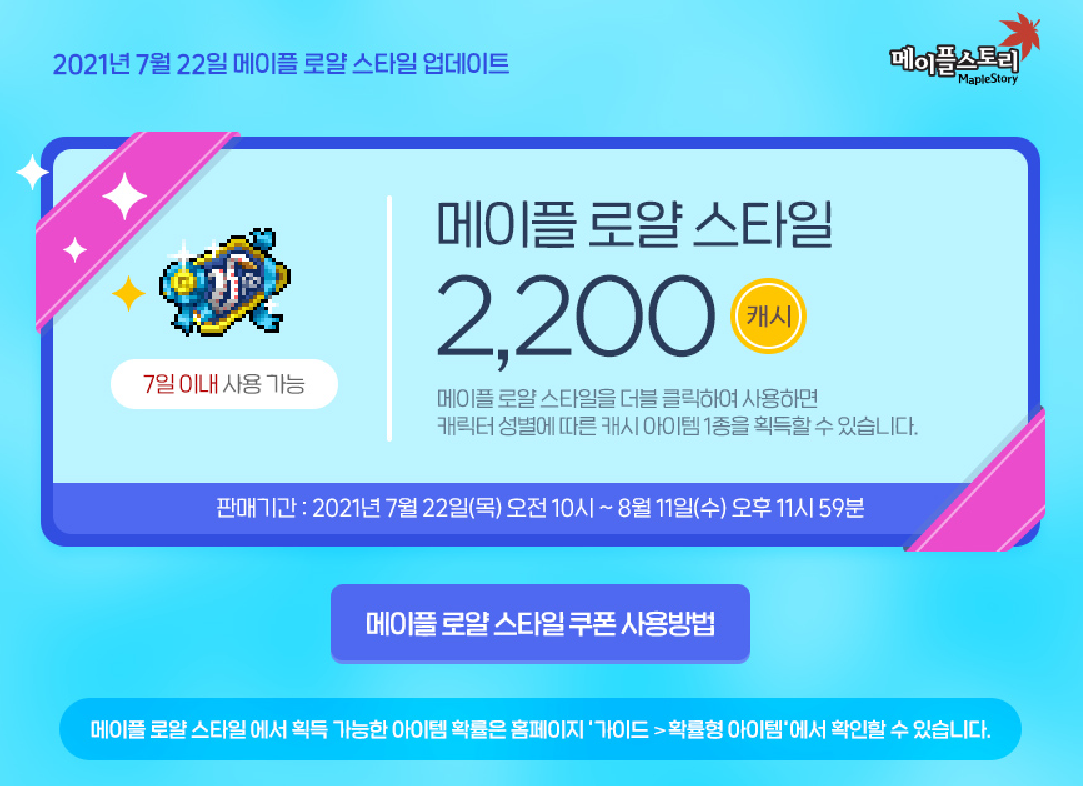 7월 22일 캐시아이템 업데이트 - 로얄스타일 쿠폰&마스터피스, 마라벨 13기, 스라벨 100기, 마스터피스, 로얄스타일 확률
