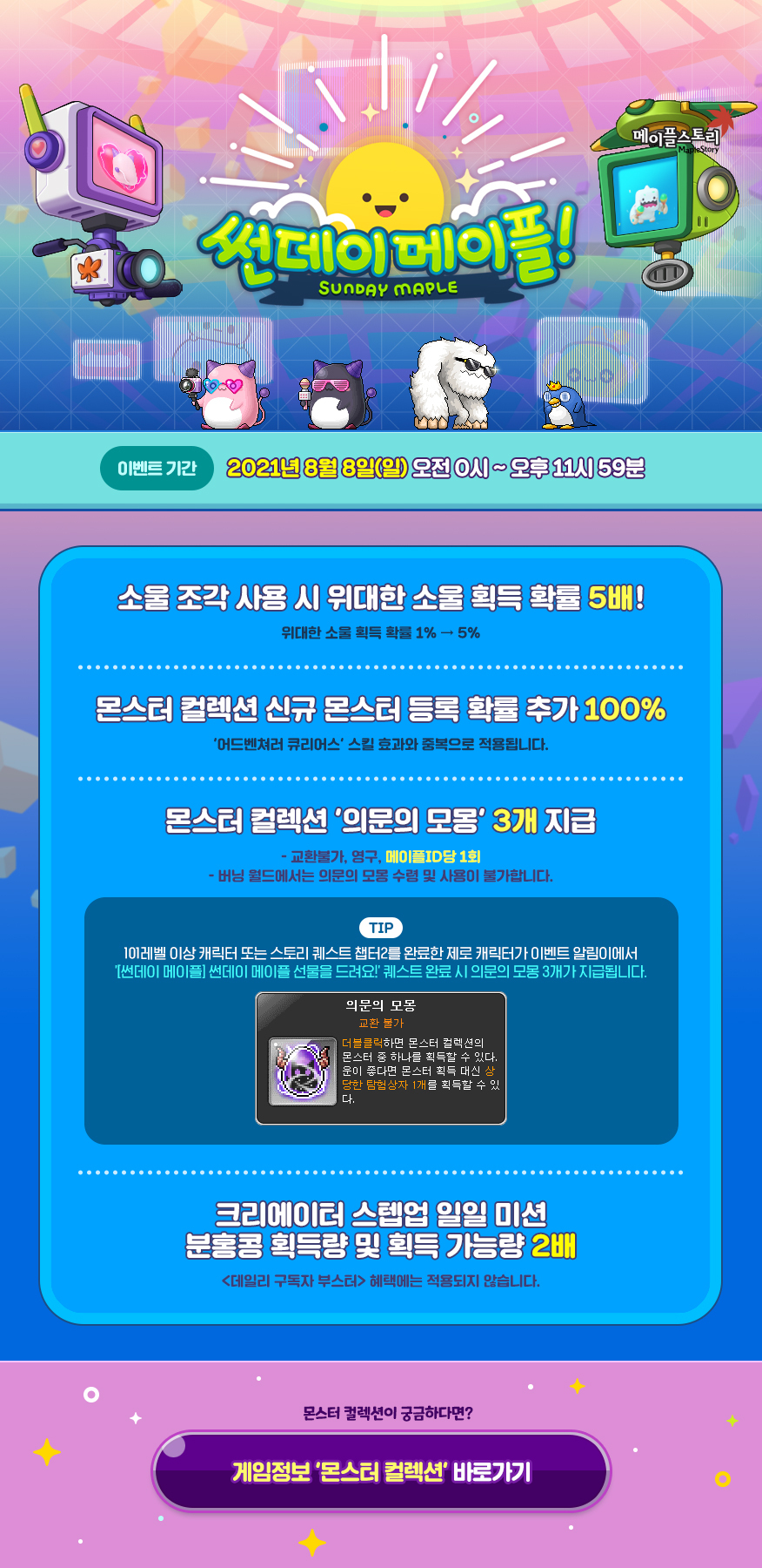 2021년 08월 08일 썬데이 메이플! - 위소울 5배, 몬컬 확률 추가, 의문의 모몽 지급, 분홍콩 획득량 2배