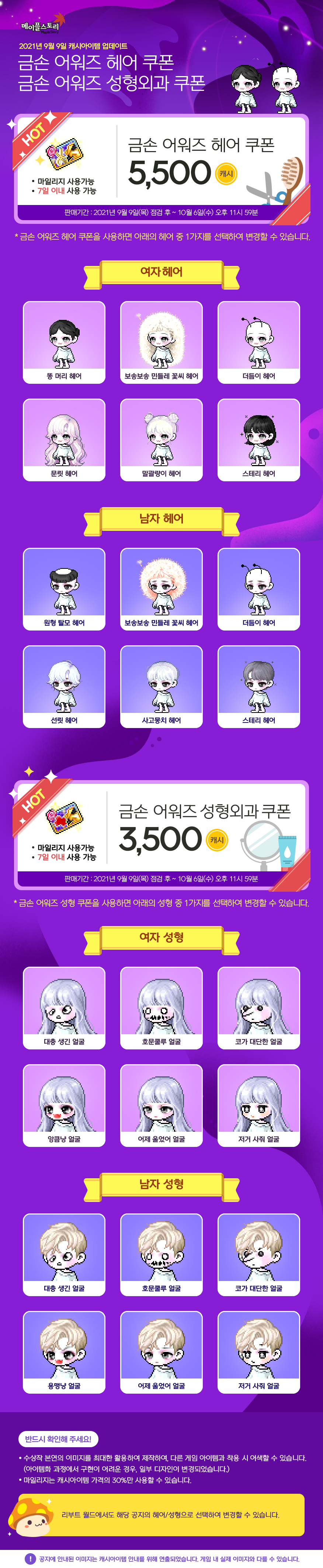 메이플 9월 9일 캐시아이템 업데이트 - 금손 어워즈 헤어&성형외과 쿠폰