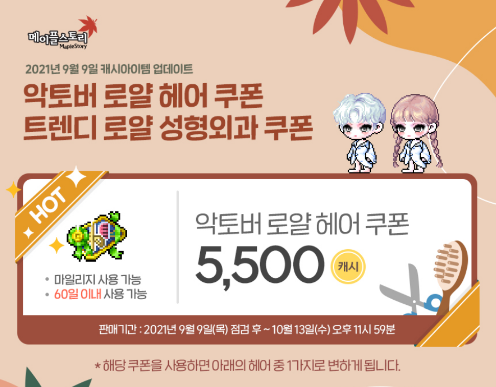 메이플 9월 9일 캐시아이템 업데이트 - 악토버 로얄 헤어& 트렌디 로얄 성형외과 쿠폰/헤어, 성형확률