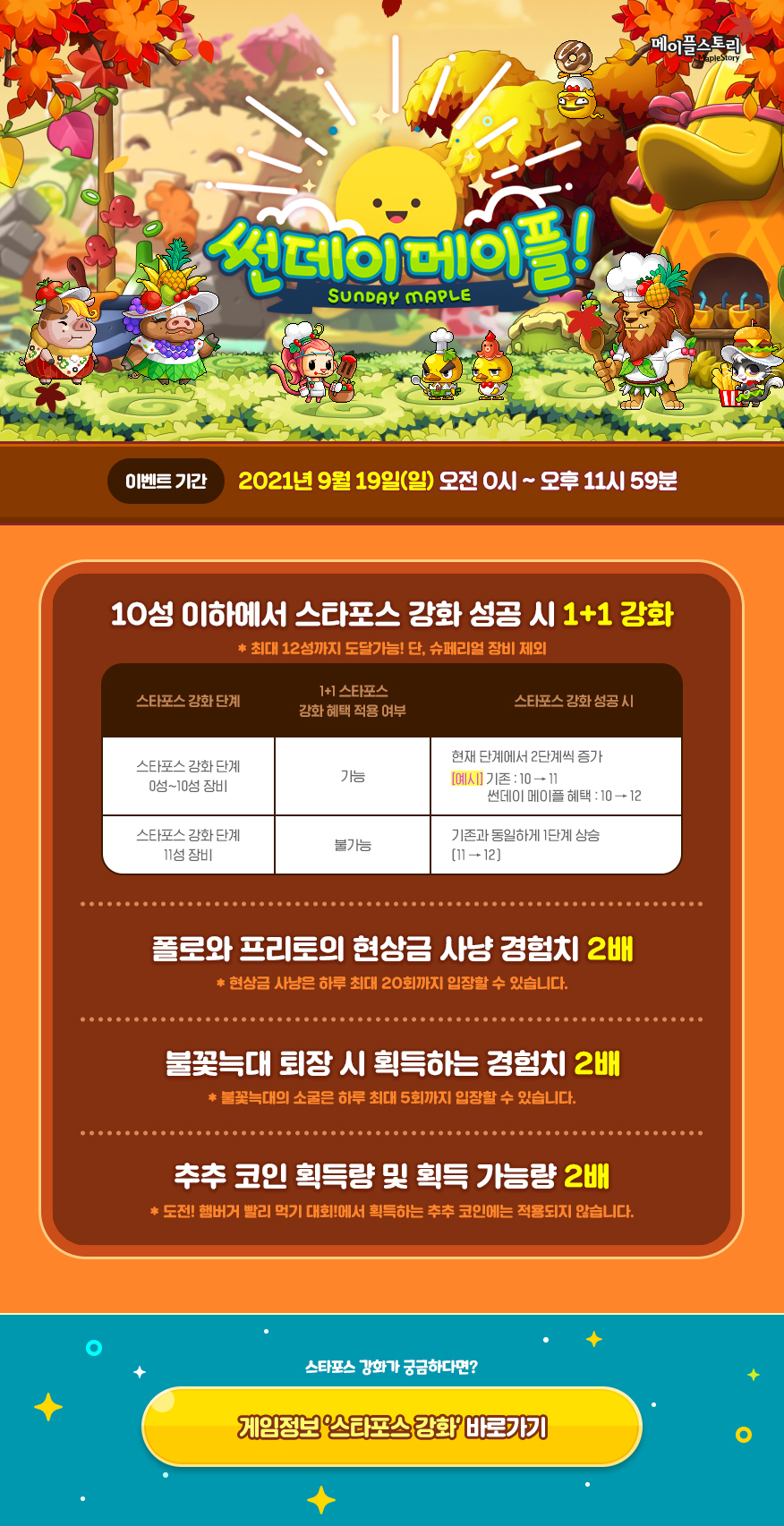 2021.09.19 썬데이 메이플! - 10성 이하 스타포스 강화 성공 시 1+1, 폴로와 프리토 경험치 2배, 불꽃늑대 경험치 2배, 추추 코인 획득량 2배