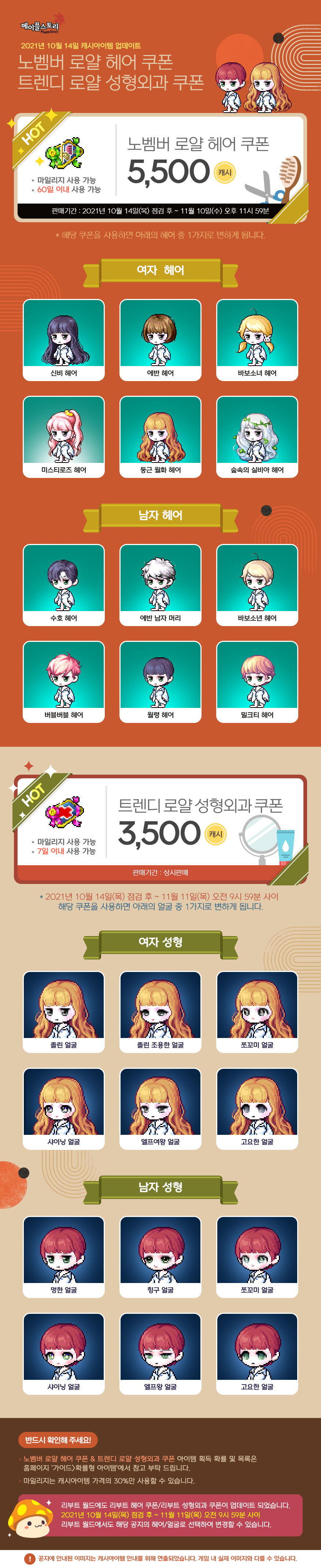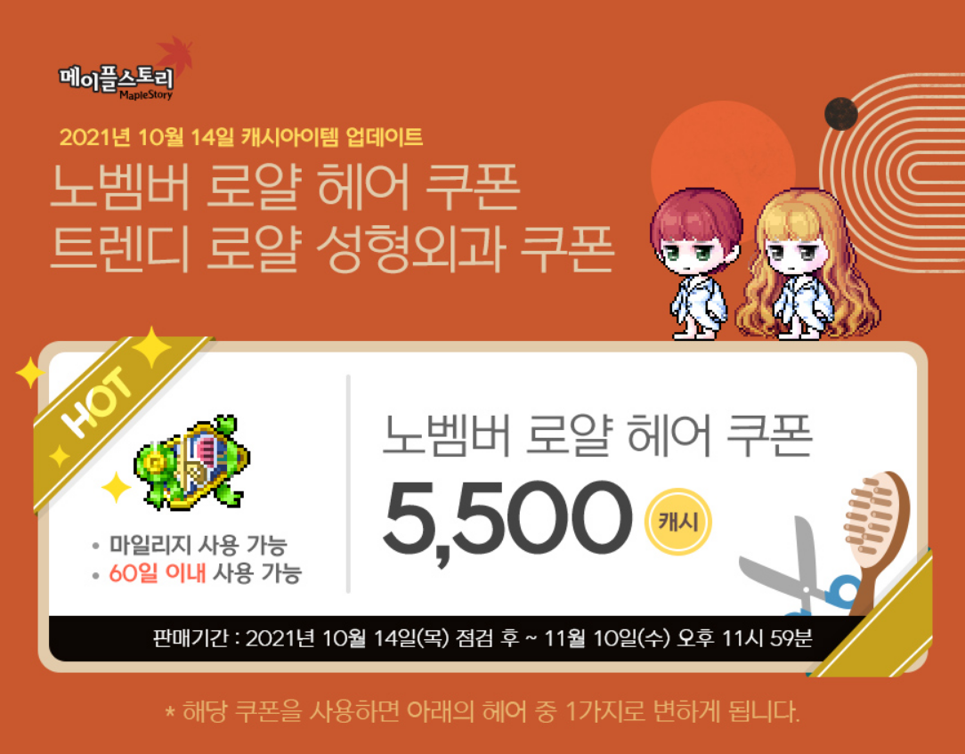 메이플스토리 2021년 10월 14일 캐시아이템 업데이트 - 노벰버 로얄 헤어&성형외과 쿠폰